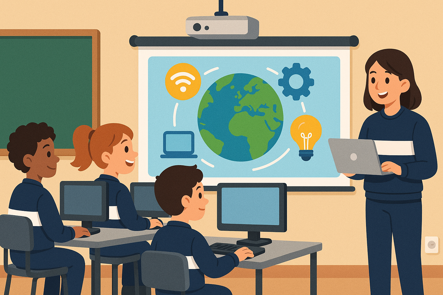 Sala de computación con internet y tecnología en el aula (Proyector, computador y telón).